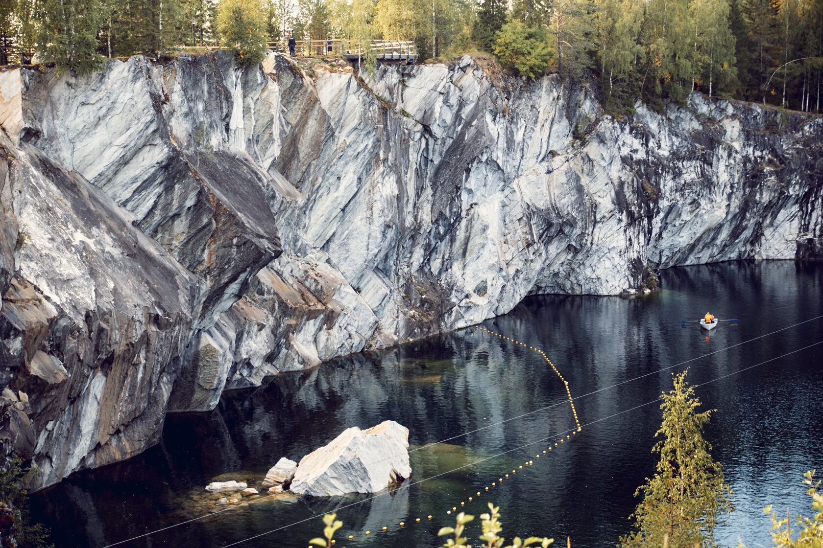 - С 1974 по 1986 годы на одном из карьеров Рускеалы добывали мраморные блоки, используя для этого станки канатного пиления, созданные в Италии. Так образовался «Итальянский» карьер с ровными, как бы полированными уступами, на которых запечатлен причудливый рисунок мрамора, образовавшегося из морских осадков по соседству с вулканом два миллиарда лет назад.